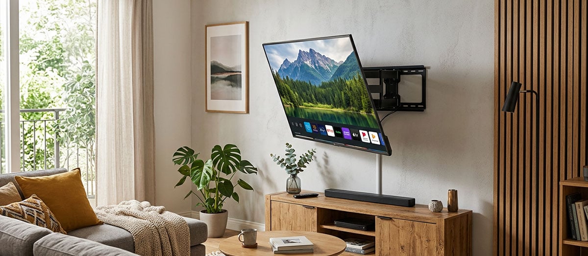 Фиксированные крепления позволяют повесить телевизор очень близко к стене, что идеально подходит для современных минималистичных интерьеров. Расстояние между телевизором и стеной при таком способе установки составляет всего несколько сантиметров, создавая эффект ‘картины’, висящей на стене.
